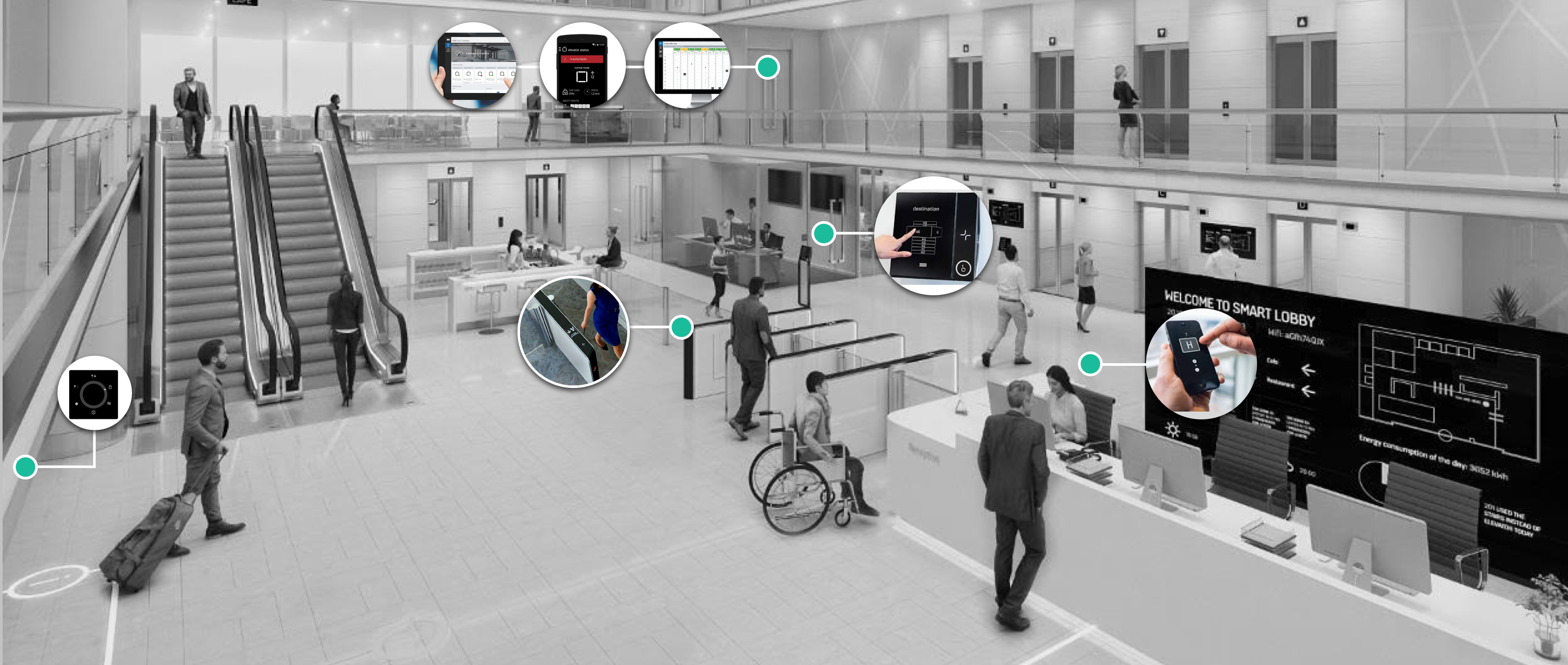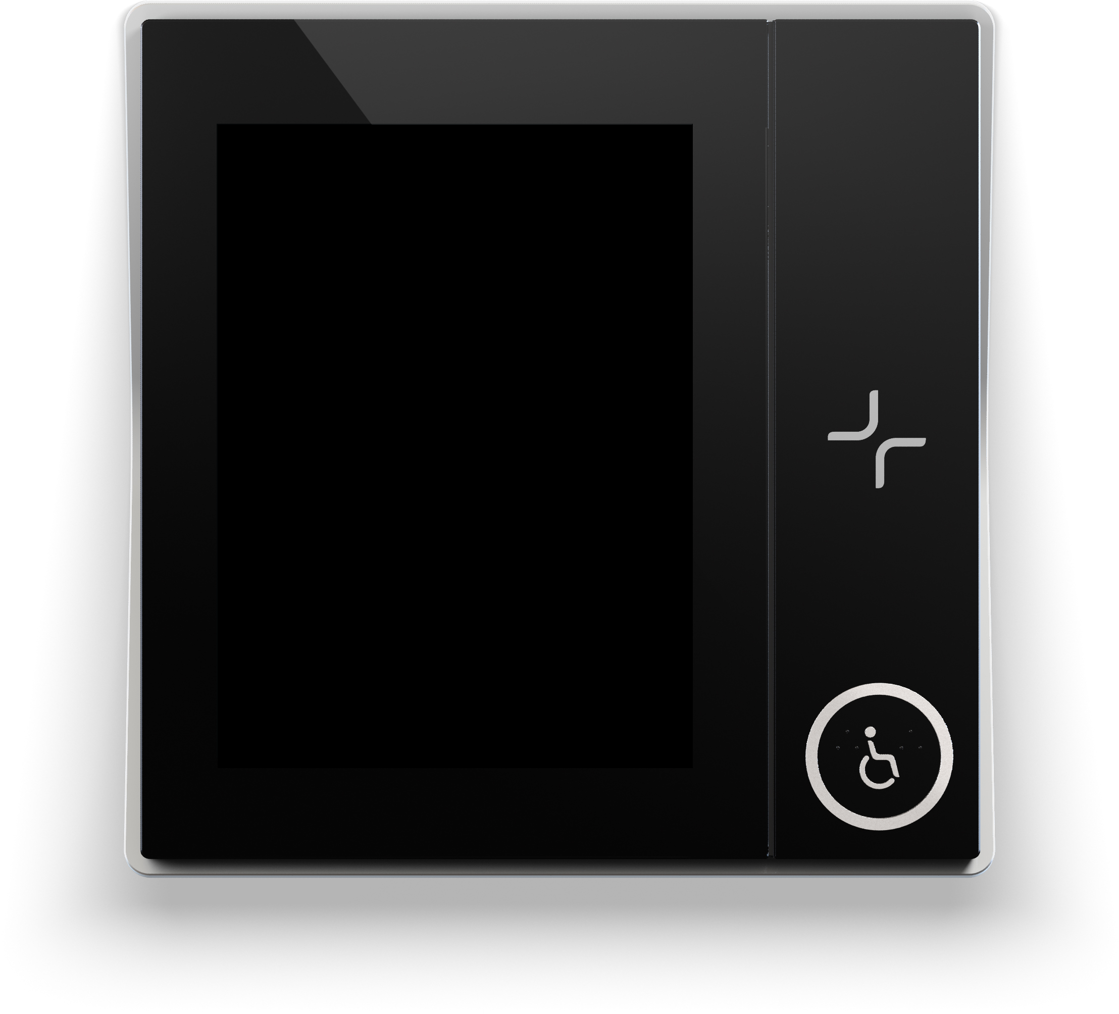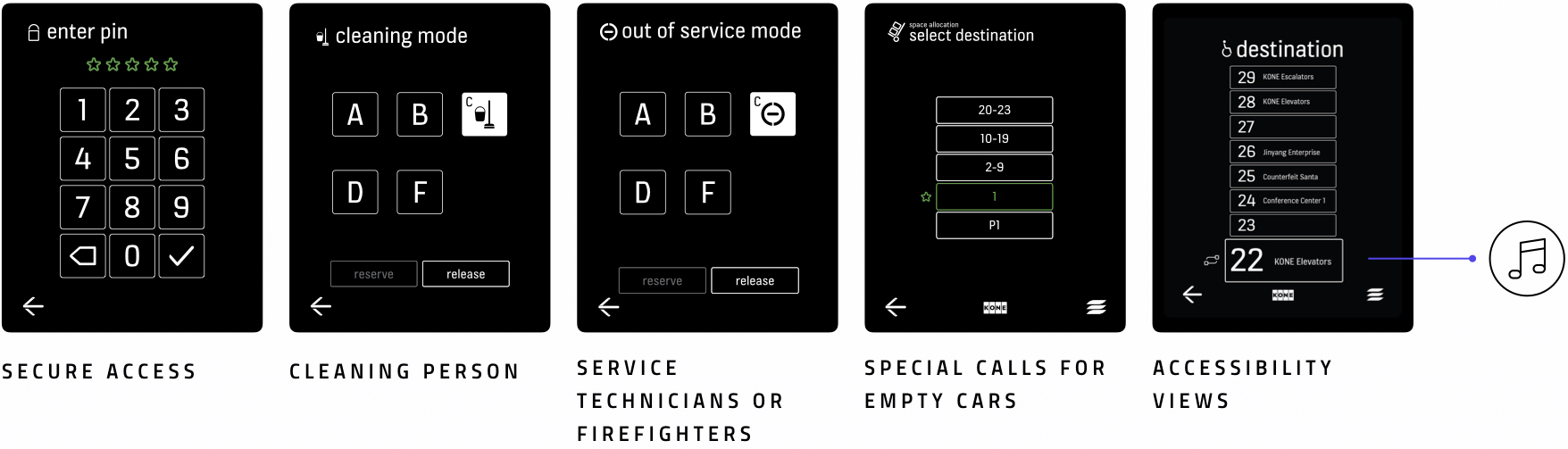 KONE GUI design offers simplicity, clarity and automation, high contrast and graphical ergonomics for better usability. In addition, audio feedback, guidance and control through a physical accessibility button give an alternative to the graphical interface.