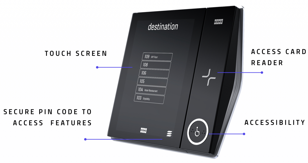 Destination operating panel is an award winning touch screen solution to replace traditional button interfaces for elevators in modern high-rise buildings.