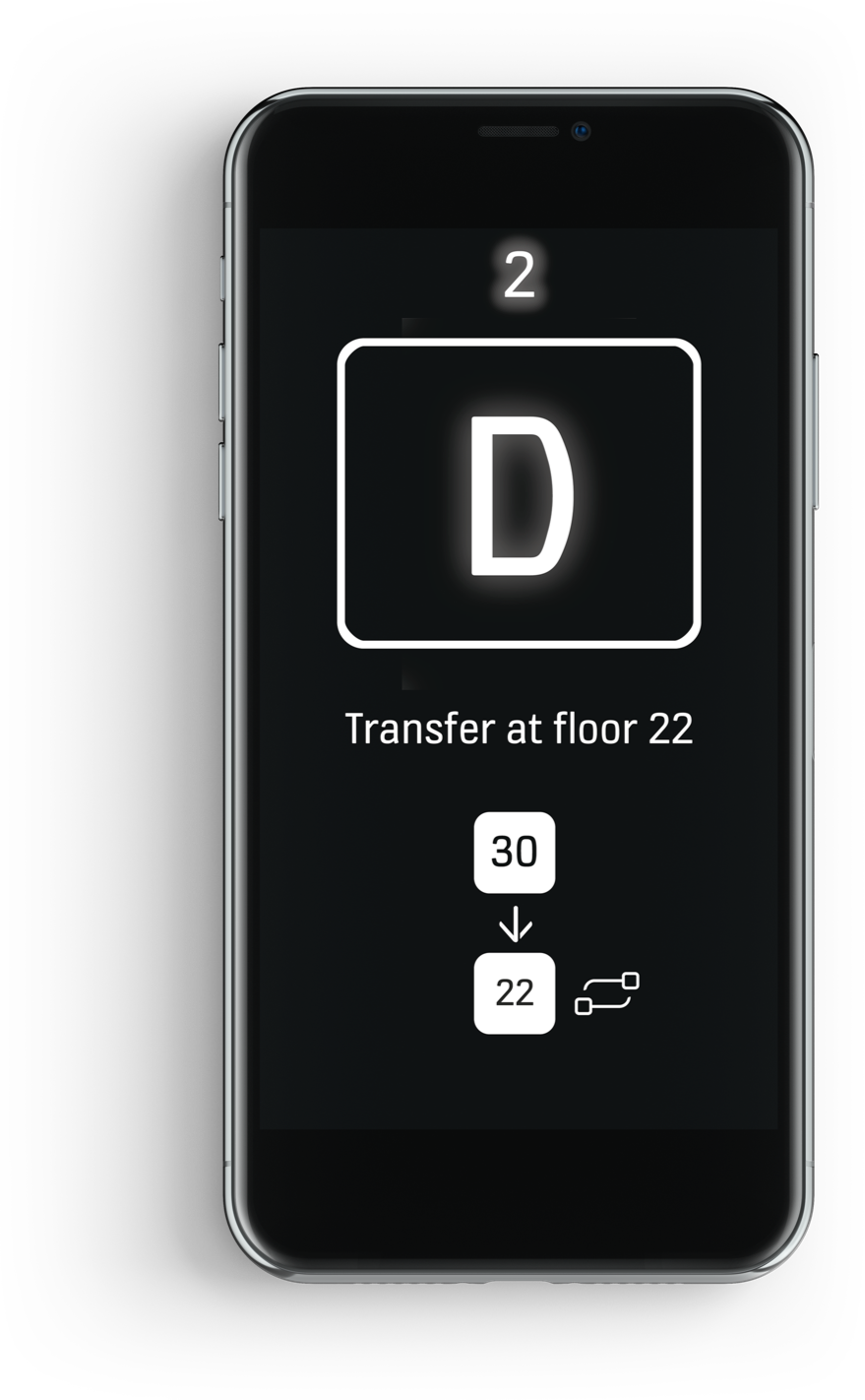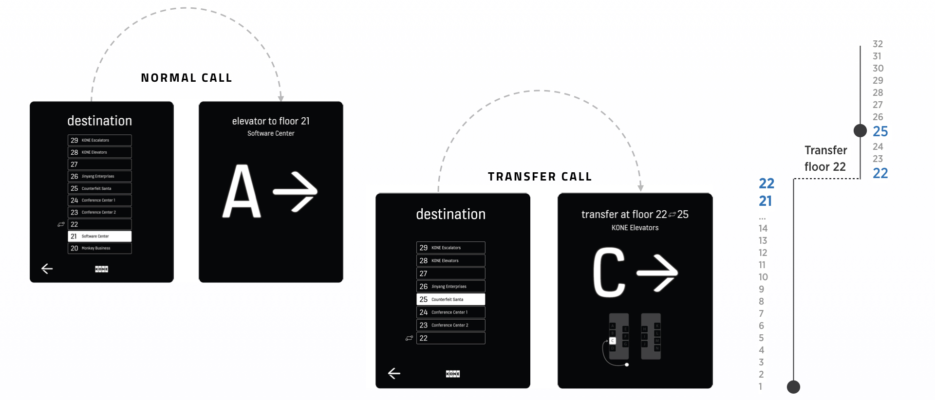 Transfer is when users wishes to go to certain floor, but is instead transferred to another floor. This is due to complex and high rise building setups where elevators cannot ride high distances. Users need clear guidance in such cases.