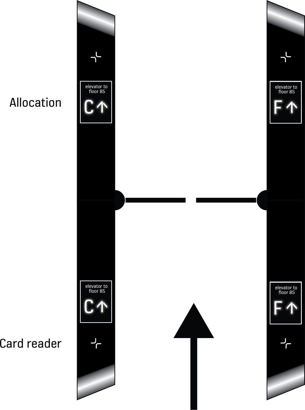 The turnstile is intergated with the users' access card control and can call for an elevator for the user instantly. This helps users navigate to the guidaded elevators in a much secure and faster way.