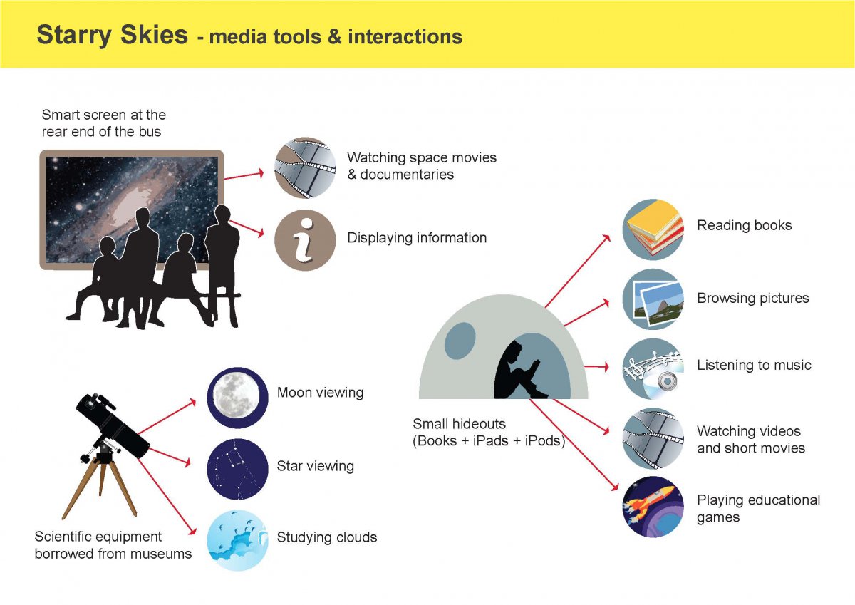 Building upon the research for the new library bus for Espoo, five concepts were proposed to revolutionise the service. These concepts aimed to demonstrate how the technology in the bus could be used to facilitate various kinds of workshops and events. Some of the more immersive ideas proposed were the Starry Skies, Gardening, Craft-workshop, Movie-nights, Storytelling and a concept for the regular bus.