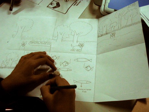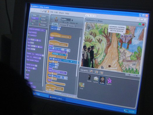 Kadina-Loka, a ten-day summercamp with children from urban slums; conceptualised around games in Scratch and the fantasy of a haunted forest-world. The children went through a process that taught them to programme games through art. They conceptualised the story-lines, developed characters, edited images, programmed and finally shared their creations online at www.scratch.mit.edu/galleries/view/50414