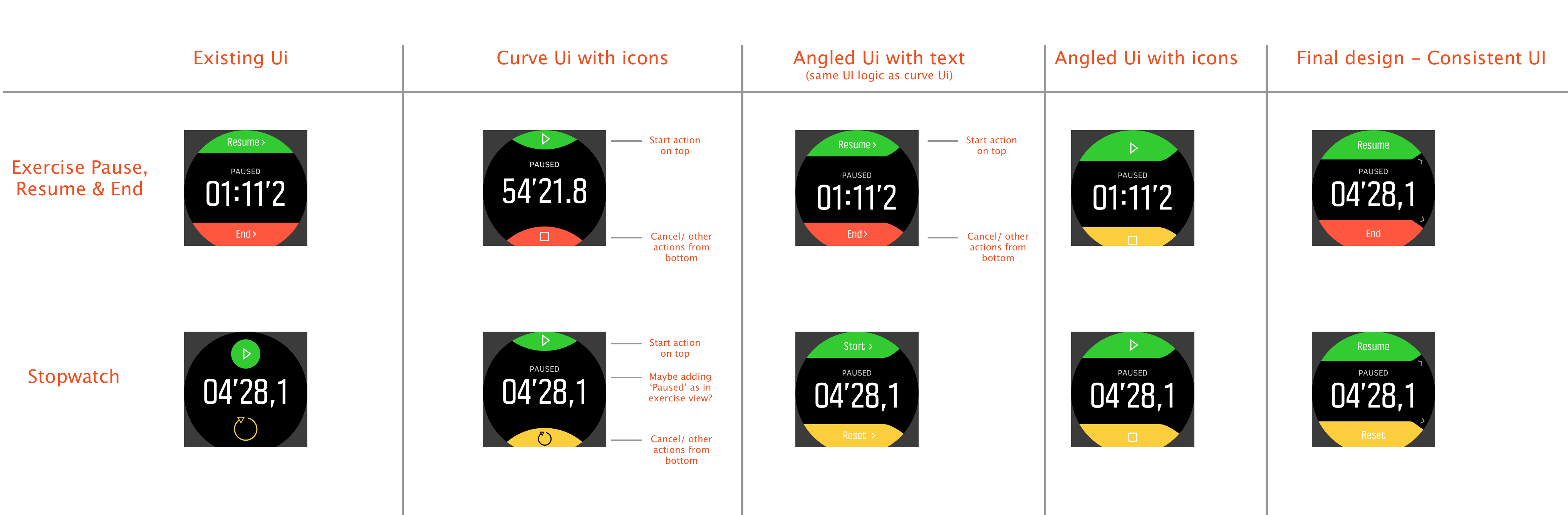 The iteration above shows variation in using text vs. icons. In the above example users were not able to understand that the ‘Resume’ and ‘End’ button in exercise mode could also be controlled through the press of the buttons. Adding a small arrow next to button and making the buttons angled and direct towards them, helped the users understand this logic.