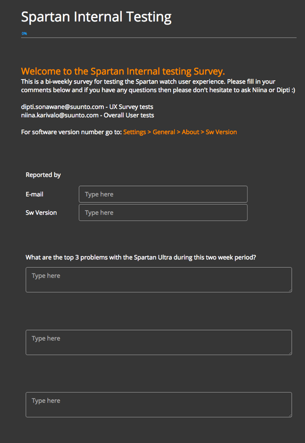 I conducted a bi-weekly online survey for Suunto to internally test the usability and interaction of the Spartan Ultra watch. This was done while the product was in development. The the survey questionnaire was to get an immediate feedback from the testers.Relevant design changes were made based on the results.