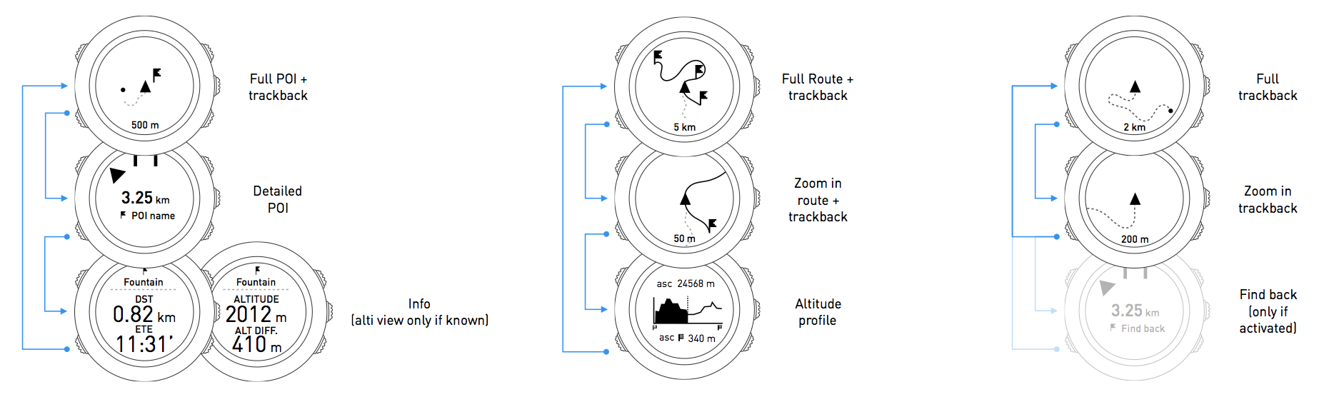 In addition to designing the Spartan watch I worked also on designsfor the Ambit product line. The Ambit family watches had a black and white display with no touch functionality. These were some of the legacy watches that were designed for specific groups of users based on their interest, such as adventure sports, outdoor and travel. I worked on wireframing and designing feature wise scenarios, pixel perfect UIs and icon designs, and maintaining the specifications across 4 product lines (Suunto Kailash, Travese, Vertical and Ambit 3)